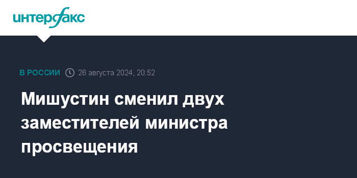 Москва. 26 августа. INTERFAX.RU - Премьер-министр Михаил Мишустин освободил заместителей министра просвещения Татьяну Васильеву и Анастасию Зырянову от занимаемых должностей, новыми замминистра назначены Ольга Колударова и Ирина Шварцман.