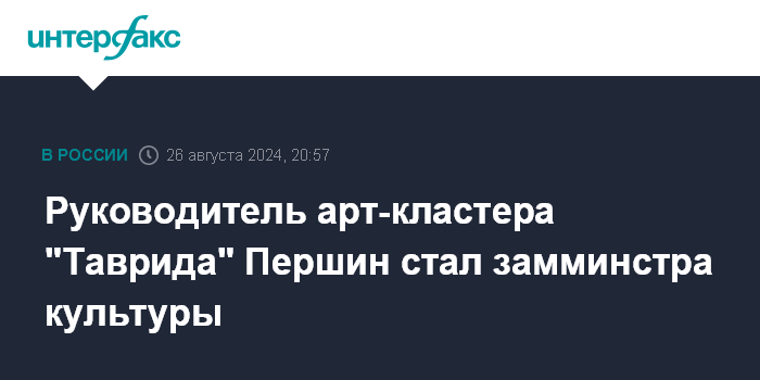 Москва. 26 августа. INTERFAX.RU - Руководитель арт-кластера "Таврида" Сергей Першин назначен заместителем министра культуры России, соответствующее распоряжение правительства опубликовано на официальном портале правовой информации.