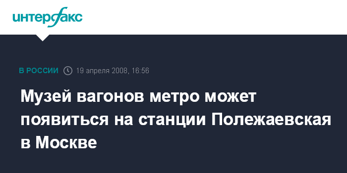 Москва. 19 апреля. ИНТЕРФАКС - МОСКВА - В столичном метрополитене планируется к 2010 году - 75-летию Московского метро - создать музей подвижного состава, где будут собраны вагоны разных лет, сообщил начальник московского метро Дмитрий Гаев.