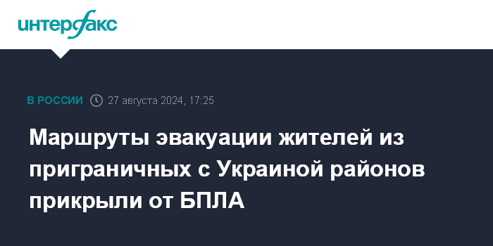 Москва. 27 августа. INTERFAX.RU - Силовые структуры обеспечили прикрытие от беспилотников маршрутов движения транспорта в ходе эвакуации граждан из опасных районов рядом с границей РФ и Украины, сообщил начальник Национального центра управления обороной РФ генерал-лейтенант Станислав Гаджимагомедов.