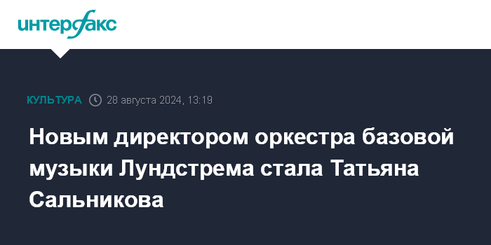 Москва. 28 августа. INTERFAX.RU - Новым директором Оркестра джазовой музыки имени Олега Лундстрема назначена Татьяна Сальникова, сообщила министр культуры РФ Ольга Любимова.
