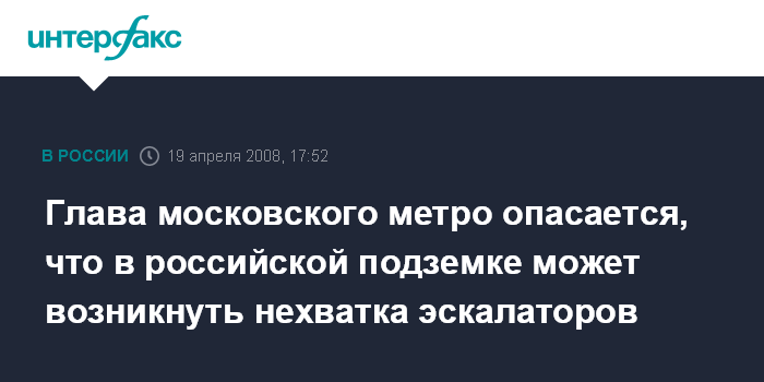 Москва. 19 апреля. ИНТЕРФАКС-МОСКВА - В России может возникнуть нехватка новых эскалаторов для метрополитена, заявил начальник столичного метрополитена Дмитрий Гаев.