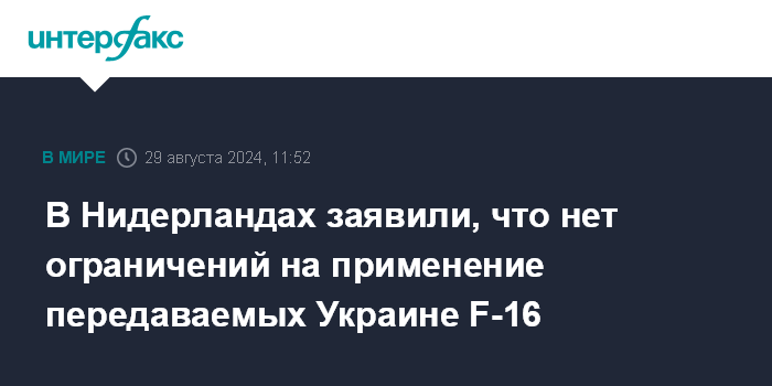 Москва. 29 августа. INTERFAX.RU - Украина может использовать переданные Нидерландами истребители F-16 так, как посчитает нужным, в том числе над территорией России, заявил командующий ВС страны генерал Онно Эйхельсхейм. Его слова приводят нидерландские СМИ.