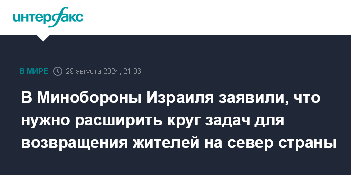 Москва. 29 августа. INTERFAX.RU - Армии обороны Израиля (ЦАХАЛ) нужно выполнить более значительные задачи, нежели стоят перед ней сейчас, чтобы позволить перемещенным лицам вернуться в свои дома на севере Израиля, заявил глава израильского Минобороны Йоав Галант.