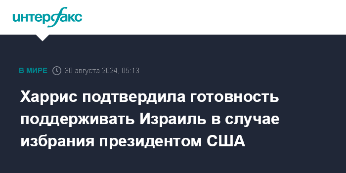 Москва. 30 августа. INTERFAX.RU - Кандидат в президенты США демократка Камала Харрис заявила, что в случае ее избрания на пост главы государства она продолжит оказывать поддержку и обеспечивать оборону Израиля.