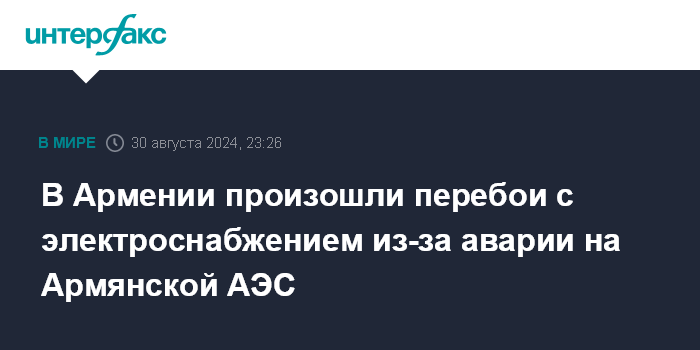 Москва. 30 августа. INTERFAX.RU - Перебои в электроснабжении наблюдаются в Армении из-за отключения от системы Армянской АЭС, сообщает министерство территориального управления и инфраструктур.