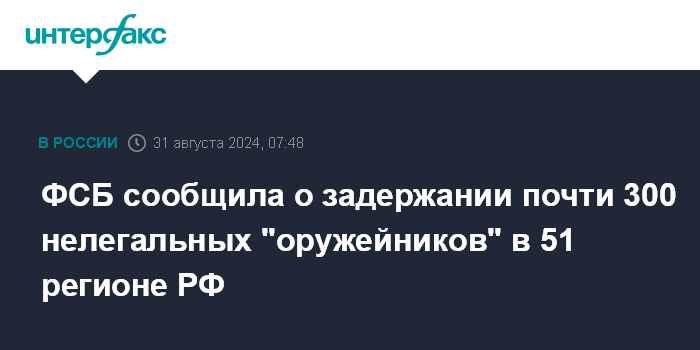Москва. 31 августа. INTERFAX.RU - В ФСБ сообщили о задержании 288 человек, причастных к незаконному обороту оружия в 51 субъекте России, прекращена работа 91 подпольной мастерской по переделке оружия.