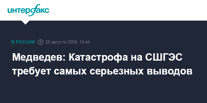 Москва. 28 августа. INTERFAX.RU - Президент РФ Дмитрий Медведев заявил, что из катастрофы на Саяно-Шушенской ГЭС необходимо сделать самые серьезные выводы.