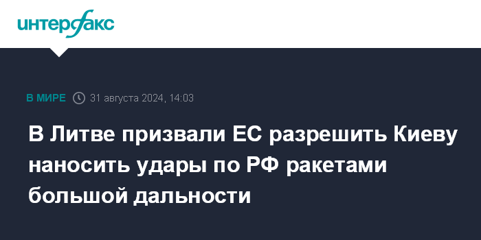 Москва. 31 августа. INTERFAX.RU - Министр национальной обороны Литвы Лауринас Кащюнас призвал руководство ЕС и стран-участниц союза разрешить Украине наносить удары по РФ полученными от них ракетами большой дальности.