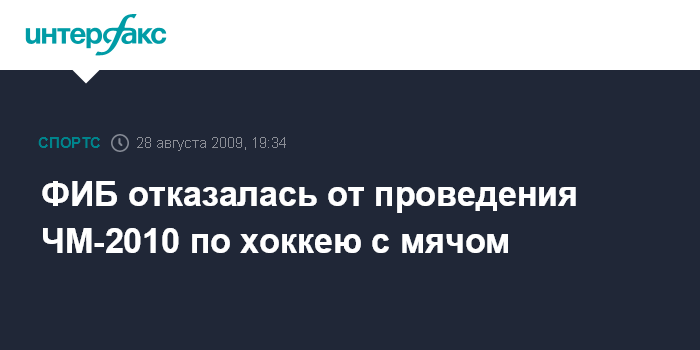 Москва. 28 августа. INTERFAX.RU – Международная федерация бэнди (ФИБ) приняла решение не проводить чемпионат мира 2010 года по хоккею с мячом, который должен был пройти в Казани.