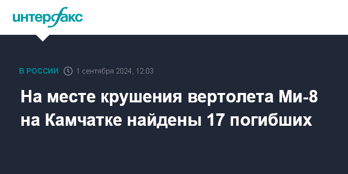 "На Камчатке спасатели МЧС РФ доставлены к месту крушения вертолета Ми-8, который пропал с радаров накануне, 31 августа. В настоящий момент уже найдены 17 тел. Поиски продолжаются", - говорится в сообщении.