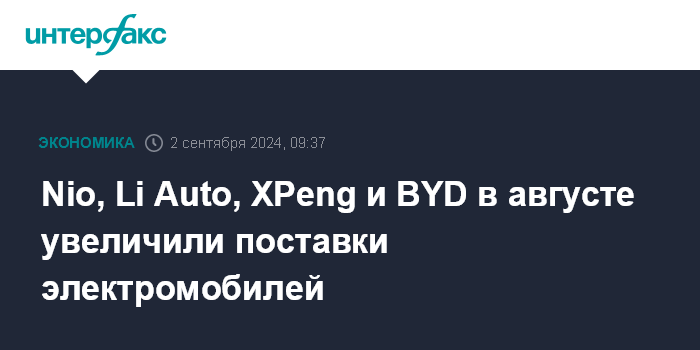 Nio, Li Auto, XPeng и BYD в августе увеличили поставки электромобилей