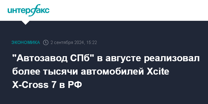 Москва. 2 сентября. INTERFAX.RU - Продажи автомобилей Xcite X-Cross 7 в РФ в августе 2024 года составили 1,005 тыс. машин. Об этом сообщает пресс-служба ООО "Автозавод Санкт-Петербург" (производитель автомобилей, бывшая площадка Nissan).