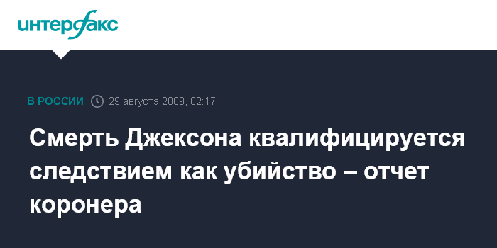 Москва. 29 августа. ИНТЕРФАКС - Коронер Лос-Анджелеса, ведущий следствие по делу Майкла Джексона, квалифицировал его смерть как убийство, сообщают зарубежные СМИ.