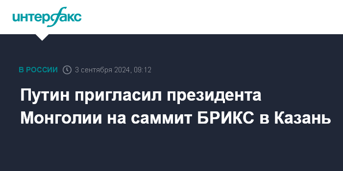 Москва. 3 сентября. INTERFAX.RU - Президент РФ Владимир Путин пригласил монгольского коллегу Ухнагийна Хурэлсуха на саммит БРИКС, который пройдет в Казани в октябре этого года.