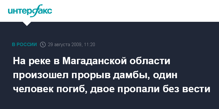 Москва. 29 августа. INTERFAX.RU - На реке Туманная в Магаданской области в субботу произошел прорыв дамбы, один человек погиб, двое - пропали вез вести.