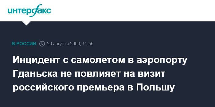 Он подтвердил, что 28 августа в аэропорт Гданьска прибыл самолет обеспечения для подготовки предстоящего визита В.Путина в Польшу, и при посадке задел крылом столб освещения. Однако, по словам пресс-секретаря, "ажиотаж, который этот инцидент вызвал у польских СМИ, совершенно не оправдан".