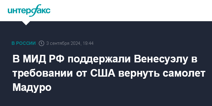 Москва. 3 сентября. INTERFAX.RU - В МИД РФ осудили конфискацию Соединенными Штатами Америки венесуэльского президентского борта, который находился на сервисном обслуживании в Доминиканской Республике.
