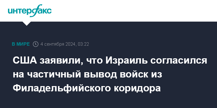 Москва. 4 сентября. INTERFAX.RU - Белый дом заявляет, что Израиль одобрил условия соглашения по прекращению огня в секторе Газа и освобождению заложников, которые включают частичный вывод Армии обороны Израиля (ЦАХАЛ) из районов вдоль Филадельфийского коридора.