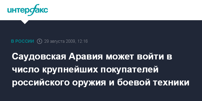 Москва. 29 августа. INTERFAX.RU - Саудовская Аравия в ближайшее время может войти в число крупнейших покупателей российского оружия и боевой техники.