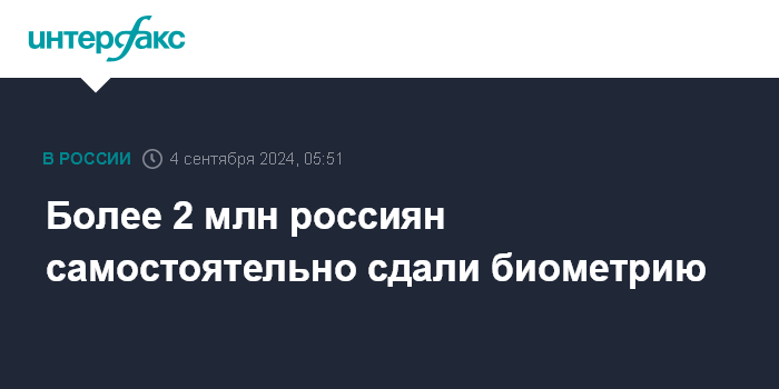 Москва. 4 сентября. INTERFAX.RU - Более 2 млн россиян самостоятельно зарегистрировались в Единой биометрической системе (ЕБС), сообщил вице-премьер Дмитрий Григоренко.
