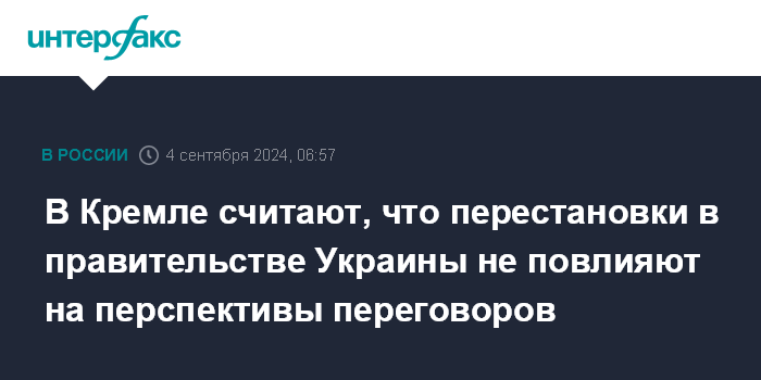 Москва. 4 сентября. INTERFAX.RU - Возможные перестановки в украинском кабинете министров не окажут никакого влияния на перспективы возобновления переговорного процесса с Киевом, заявили в Кремле.