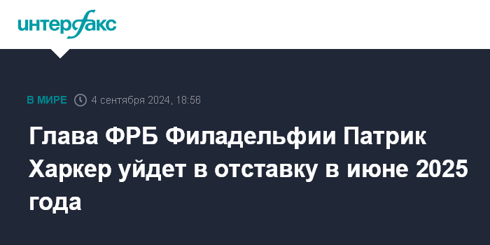 Глава ФРБ Филадельфии Патрик Харкер уйдет в отставку в июне 2025 года