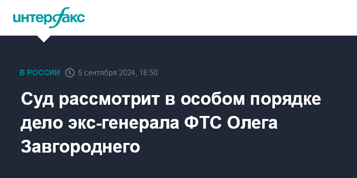Москва. 5 сентября. INTERFAX.RU - Дело бывшего генерала ФТС России Олега Завгороднего, обвиняемого по делу о скандале в отеле Калининграда, будет рассмотрено в особом порядке судебного разбирательства, сообщила пресс-служба областного суда.