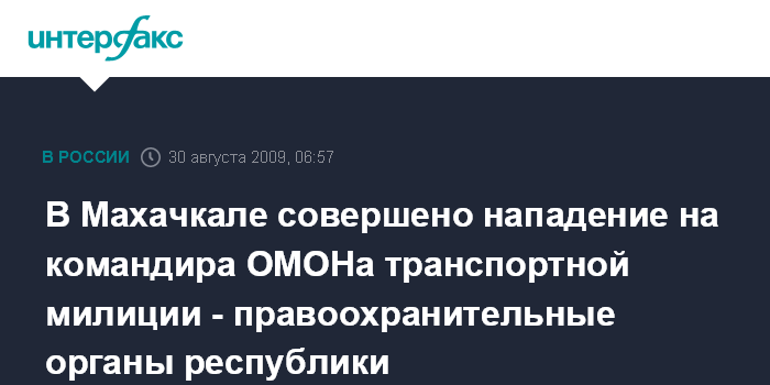 Ростов-на-Дону. 30 августа. ИНТЕРФАКС-ЮГ - В Дагестане неизвестные совершили нападение на командира ОМОНа махачкалинского линейного отдела внутренних дел на транспорте полковника милиции Магомеда Байсултанова.