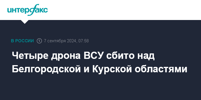 Москва. 7 сентября. INTERFAX.RU - Минобороны России заявило, что за ночь дежурными средствами ПВО уничтожено четыре украинских беспилотника самолетного типа над Белгородской и Курской областями.