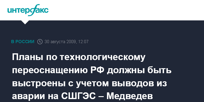 Москва. 30 августа. INTERFAX.RU - Президент России Дмитрий Медведев заявил о необходимости сделать из аварии на Саяно-Шушенской ГЭС выводы, касающиеся модернизации страны, планов по технологическому переоснащению государства, и выделил четыре аспекта, связанные с этим ЧП.