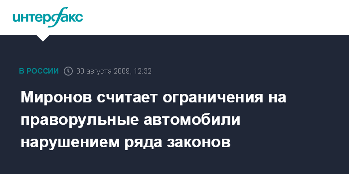 Спикер Совета Федерации также отметил, что любые попытки ограничить или запретить праворульные автомобили, как показывает практика, обернутся мощными и вполне справедливыми протестами граждан. "Государство не должно платить социальной стабильностью за прибыль автомагнатов", - сказал он.