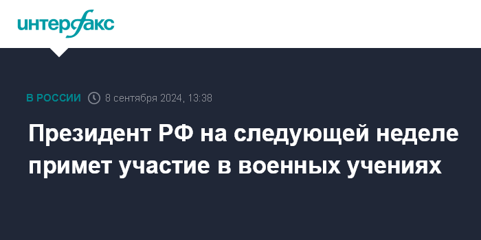 Москва. 8 сентября. INTERFAX.RU - Президент России Владимир Путин на следующей неделе примет участие в военных учениях, сообщил автор и ведущий программы "Москва. Кремль. Путин." Павел Зарубин.