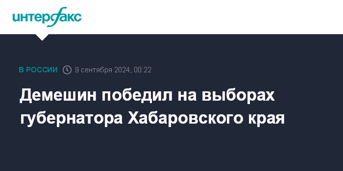 Москва. 9 сентября. INTERFAX.RU - Врио губернатора Хабаровского края Дмитрий Демешин одержал победу на выборах главы региона, следует из данных ЦИК.