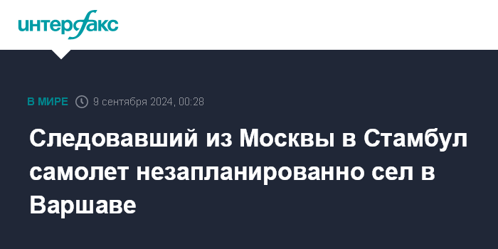 Москва. 9 сентября. INTERFAX.RU - Самолет турецкой авиакомпании во время полета из Москвы в Стамбул совершил незапланированную посадку в Варшаве.