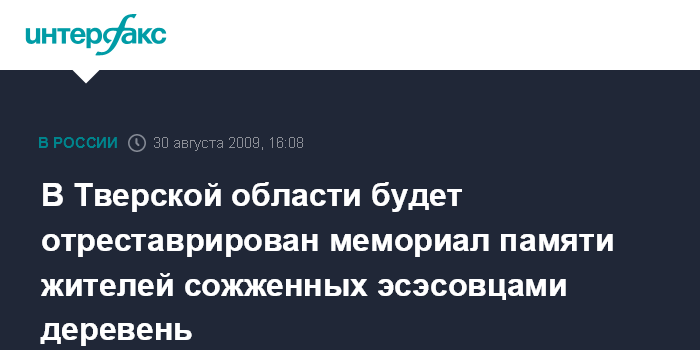 Тверь. 30 августа. INTERFAX.RU - К 65-летию Победы в Великой Отечественной войне в Тверской области будет отреставрирован мемориал памяти жителей сожженных деревень, сообщили "Интерфаксу" в обладминистрации.