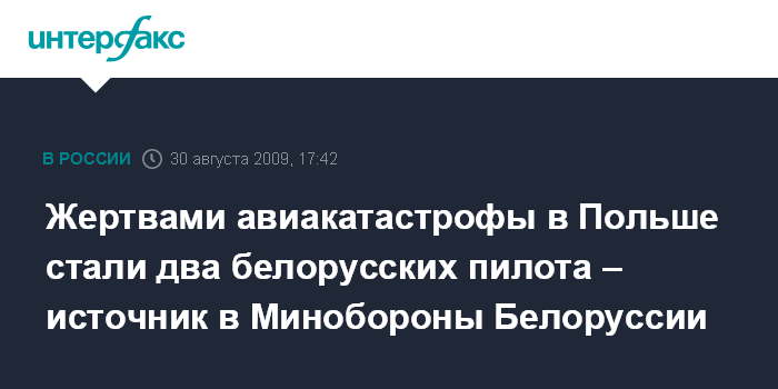 Минск. 30 августа. INTERFAX.RU - Два человека погибли в авиакатастрофе белорусского истребителя Су-27, произошедшей в воскресенье в Польше на ежегодном авиашоу, сказал агентству "Интерфакс-Запад" источник в министерстве обороны Белоруссии.