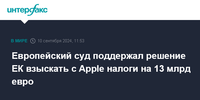 Москва. 10 сентября. INTERFAX.RU - Европейский суд (European Court of Justice, высшая судебная инстанция ЕС) счел правомерным решение Еврокомиссии взыскать с американской Apple Inc. налоги на сумму 13 млрд евро, сообщает CNBC.