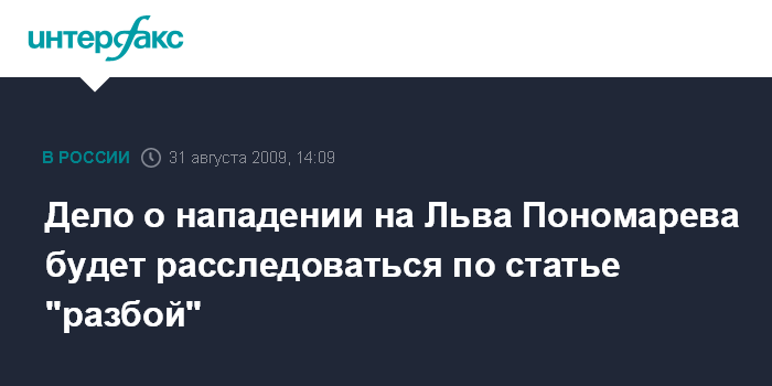 Москва. 31 августа. INTERFAX.RU - Следствие переквалифицировало дело о нападении на лидера движения "За права человека" Льва Пономарева со статьи "избиение" на более тяжкую статью "разбой" Уголовного Кодекса России.