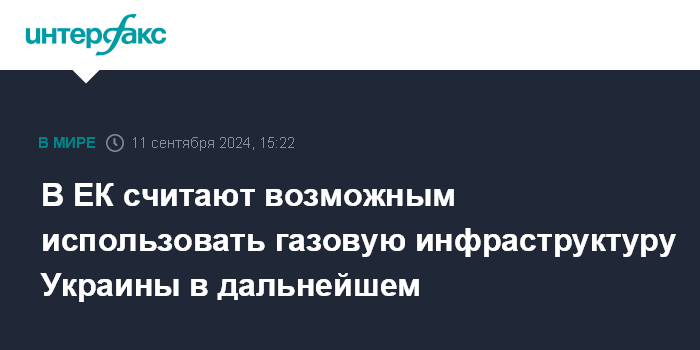 Москва. 11 сентября. INTERFAX.RU - В Еврокомиссии считают, что украинская газовая инфраструктура может использоваться европейскими компаниями для транзита газа после истечения контракта с "Газпромом", заявила на пресс-конференции в Брюсселе член ЕК по энергетике Кадри Симсон.