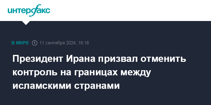 Москва. 11 сентября. INTERFAX.RU - Президент Ирана Масуд Пезешкиан в среду в ходе визита в столицу Ирака Багдад заявил, что исламским странам следует отменить погранконтроль на границах между государствами, как это сделали в Европе страны Шенгенского соглашения, сообщает агентство "Тасним".