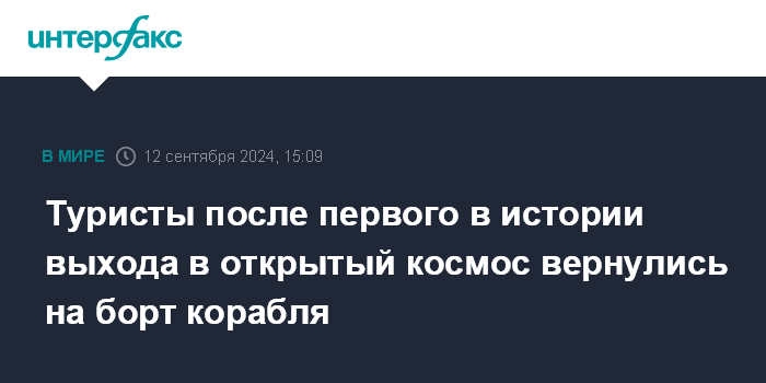 Москва. 12 сентября. INTERFAX.RU - Двое членов экипажа американского многоразового корабля Crew Dragon, запущенного на орбиту с четырьмя туристами, в четверг после выхода в открытый космос успешно вернулись на его борт, сообщила компания-разработчик SpaceX.
