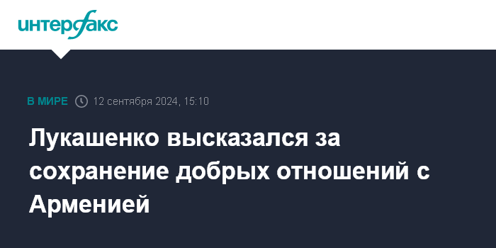 Москва. 12 сентября. INTERFAX.RU - Минск выступает за сохранение добрых отношений с Арменией, заявил президент Белоруссии Александр Лукашенко на встрече с представителями проживающих в стране нацменьшинств. Его слова приводит "БелТА".