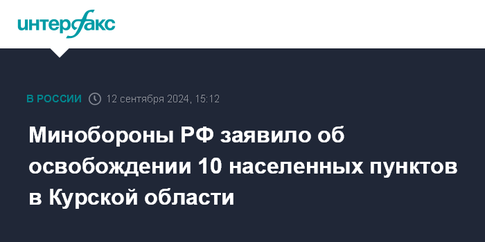 Москва. 12 сентября. INTERFAX.RU - Министерство обороны России заявило, что группировка "Север" ведет наступательные действия на курском направлении, за двое суток от украинских подразделений освобождено 10 населенных пунктов Курской области.