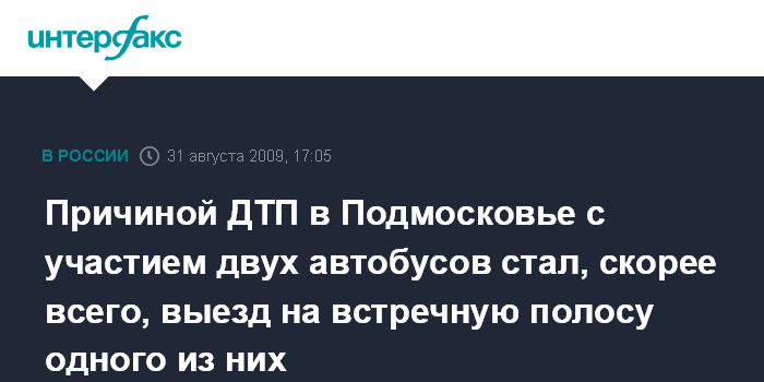 Москва. 31 августа. INTERFAX.RU – Крупная автокатастрофа, произошедшая в понедельник днем на юге Московской области, произошла, скорее всего, по вине водителя одного из автобусов, выехавшего на полосу встречного движения, сообщил "Интерфаксу" источник в правоохранительных органах.