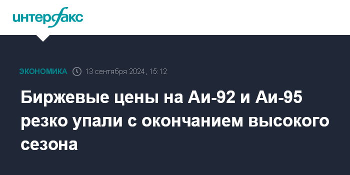 Москва. 13 сентября. INTERFAX.RU - Биржевые цены на бензин на текущей неделе с окончанием летнего высокого сезона потребления перешли к активному снижению, свидетельствуют данные Санкт-Петербургской международной товарно-сырьевой бирже (СПбМТСБ).