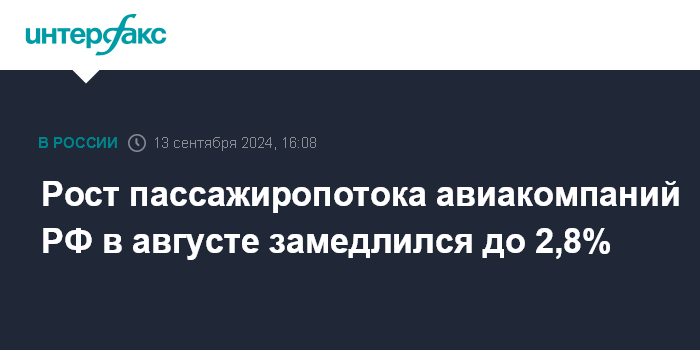 Москва. 13 сентября. INTERFAX.RU - Рост пассажиропотока российских авиакомпаний в августе 2024 года относительно того же месяца прошлого года замедлился до 2,8%, следует из оперативных данных Росавиации.