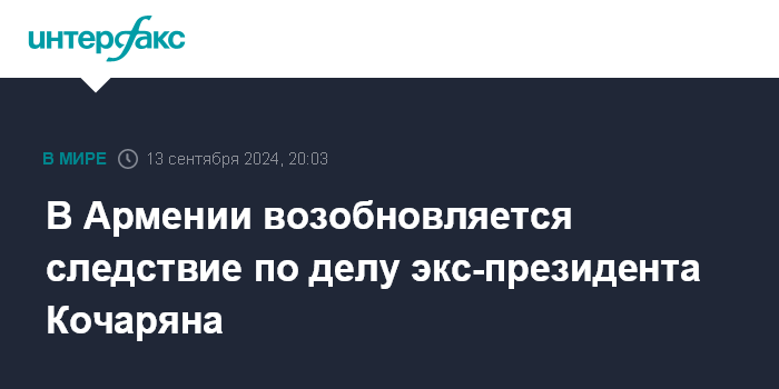 Москва. 13 сентября. INTERFAX.RU - Кассационный суд Армении отменил решение о прекращении следствия в отношении второго президента страны Роберта Кочаряна, а также бывшего генерального секретаря ОДКБ Юрия Хачатурова, сообщает пресс-служба суда.