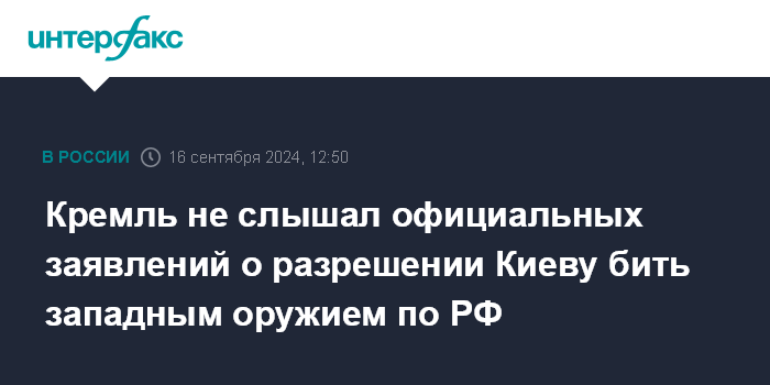 Москва. 16 сентября. INTERFAX.RU - В Кремле не слышали официальных заявлений о разрешении Киеву наносить западным оружием удары вглубь РФ, но напомнили, что ответ на такие действия содержится в недавнем заявлении президента РФ Владимира Путина.