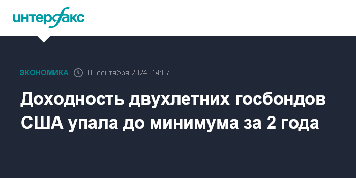 Москва. 16 сентября. INTERFAX.RU - Доходность двухлетних государственных облигаций США в понедельник обновила минимум с сентября 2022 года на возросших ожиданиях, что Федеральная резервная система может снизить процентную ставку сразу на 50 базисных пунктов.